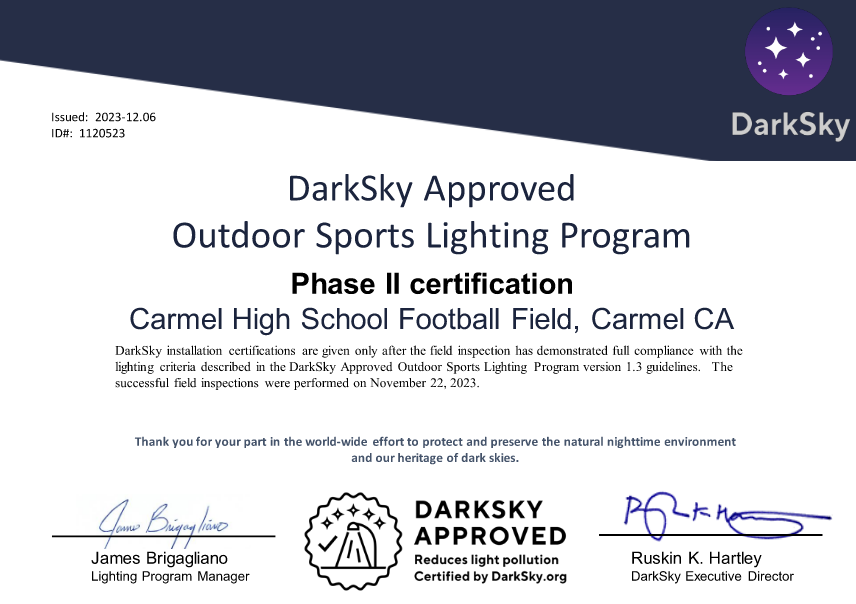 DMD undertook on-site and off site light level measurements at the Carmel Highschool football field in California (on behalf of the DarkSky International) in order to validate DarkSky requirements were met. Based on the assessment report provided by DMD the DarkSky International issued certification that requirements were met.